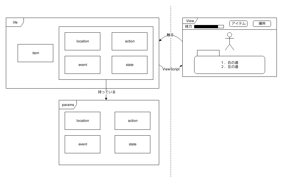 それぞれのアイテムやロケーション、アクション、イベントはrequireとeffectというFunctionを含むことが出来ます。これによって使用可能、移動可能、行動可能、発生可否やその結果を処理します。それらのFunctionにはparamsが渡さます。例えばeventであればstate.inventory.addItemでアイテムを追加してstate.lifeStatus.healthが減少。もしそのときにstate.lifeStatus.health < 30ならAパターン、それ以外ならBパターンのViewScriptを返す。みたいな処理をする形になります。